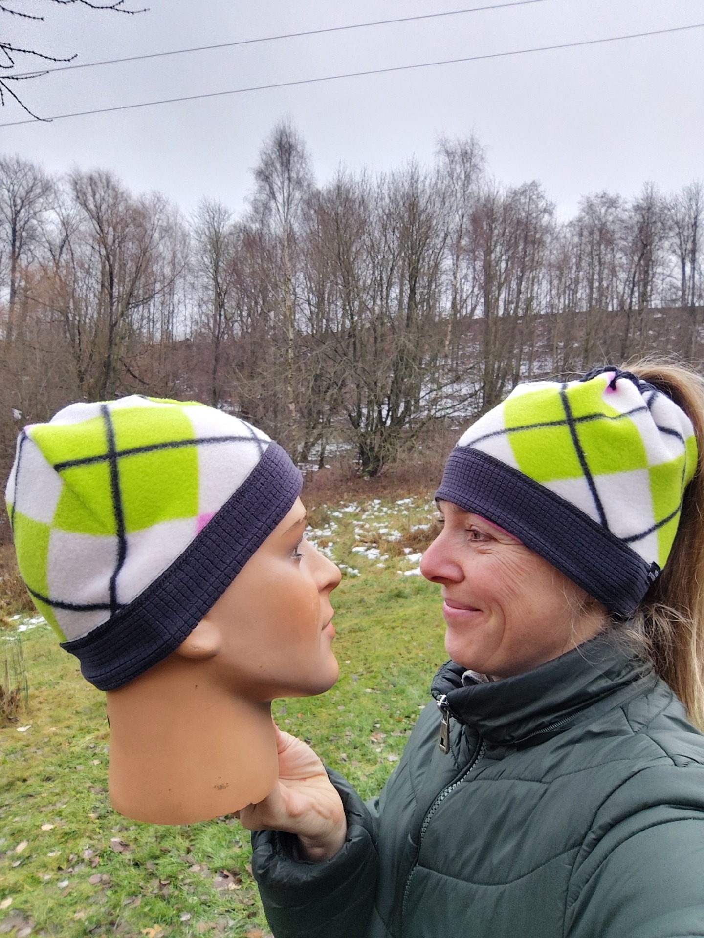 Rozměry: výška 21 cm, obvod 54 cm v nenataženém stavu - mírně pružné ... zkoušeno na hlavu s obvodem 56 cm