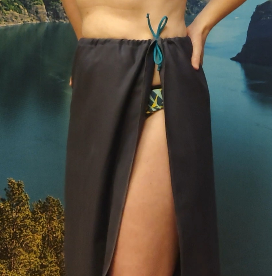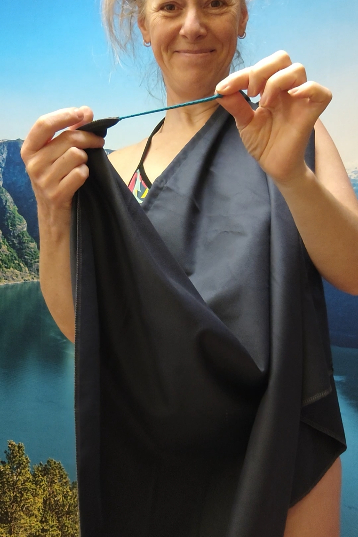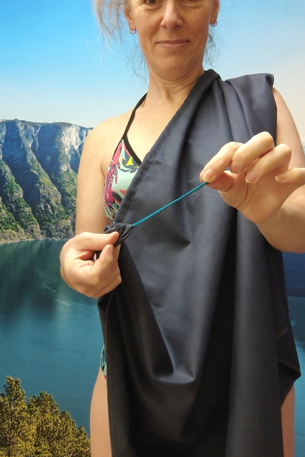Ručnik díky zavázání drží v pase, nebo zakryje střed těla.