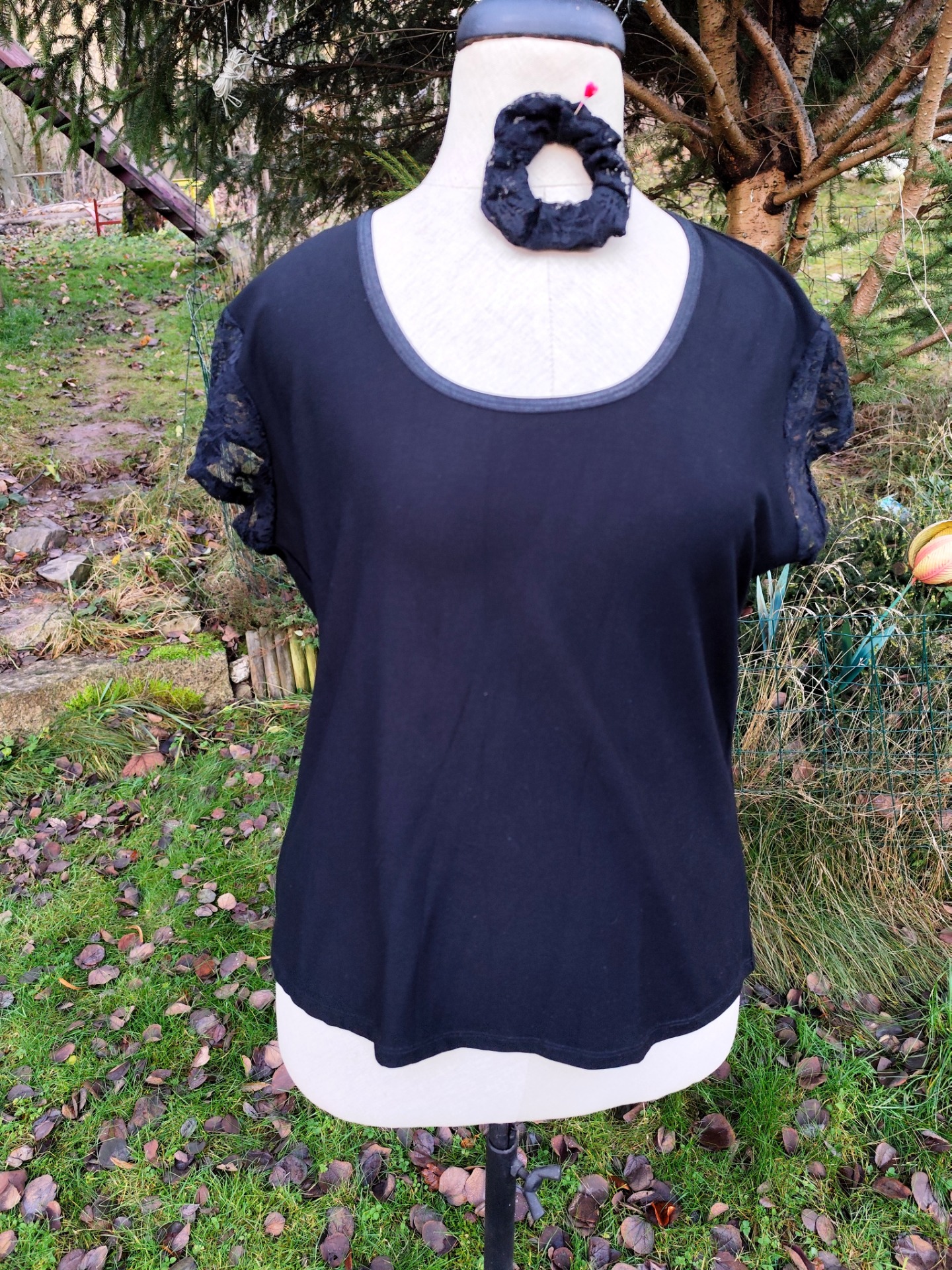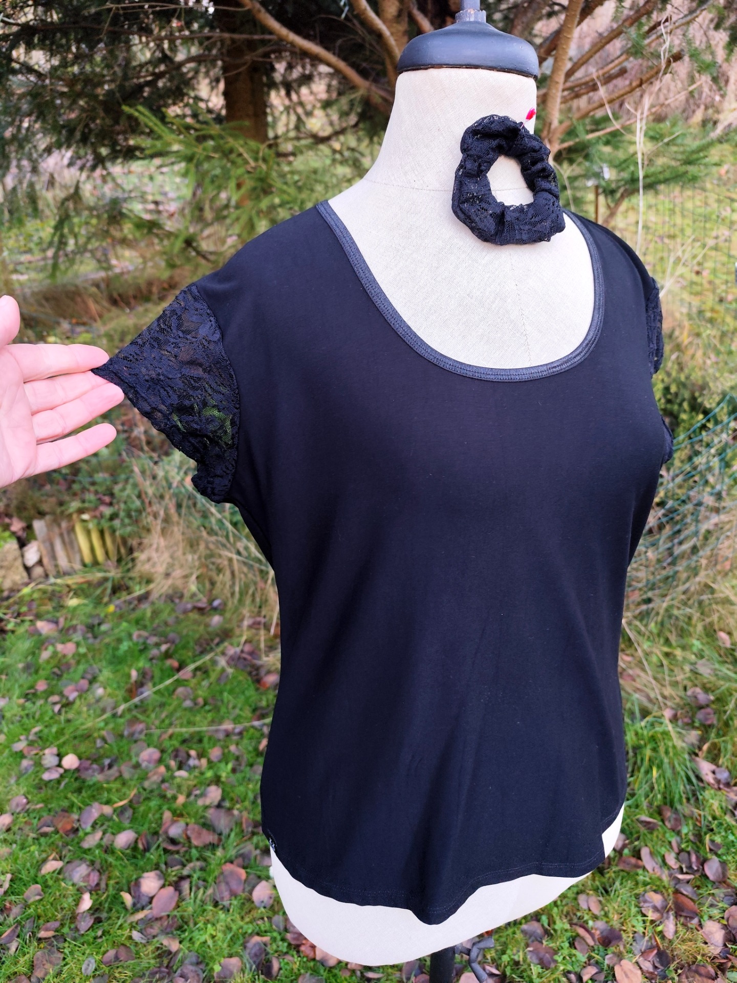 Tričko z příjemného viskózového úpletu v kombinaci s elastickou krajkou. v cerné barvě.