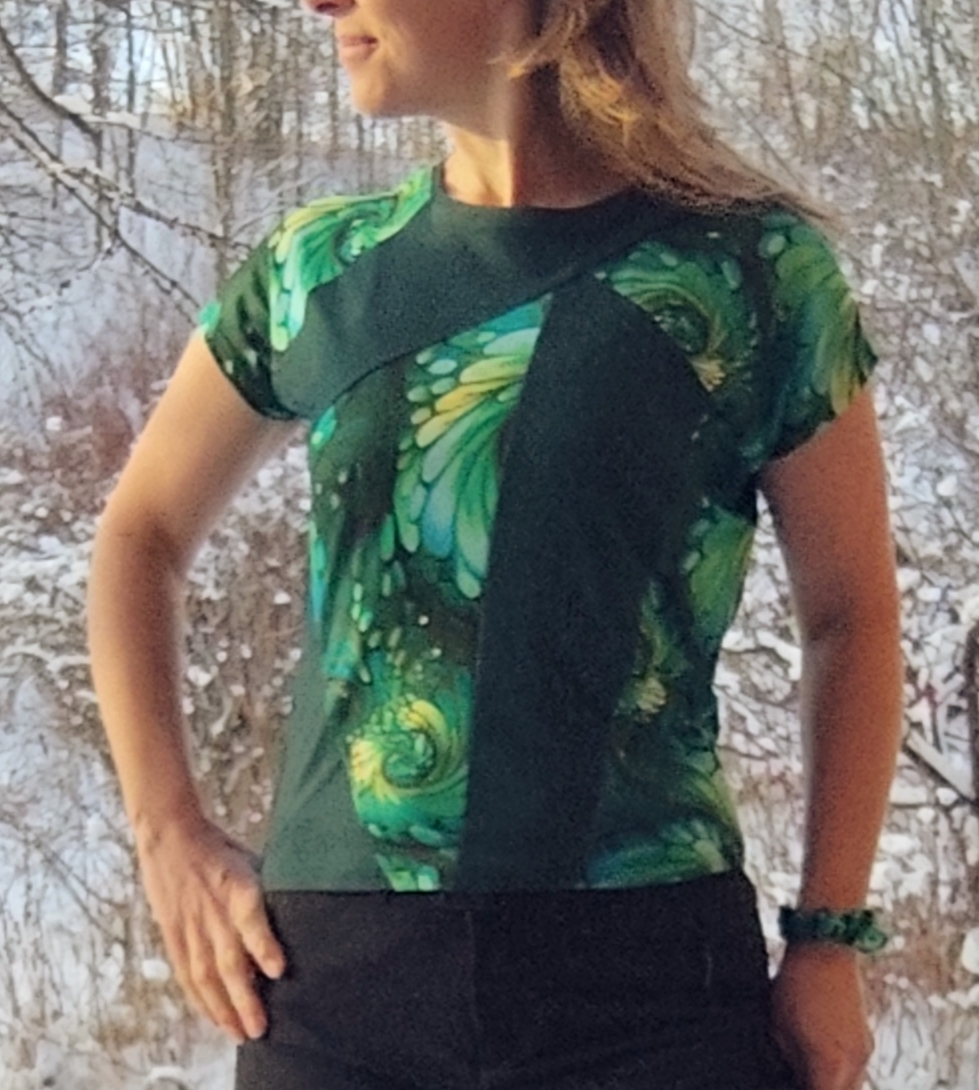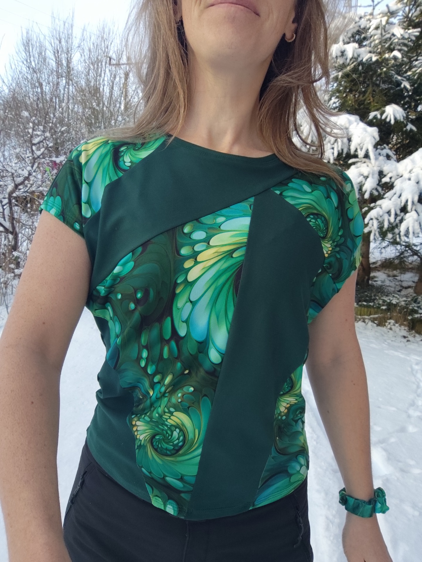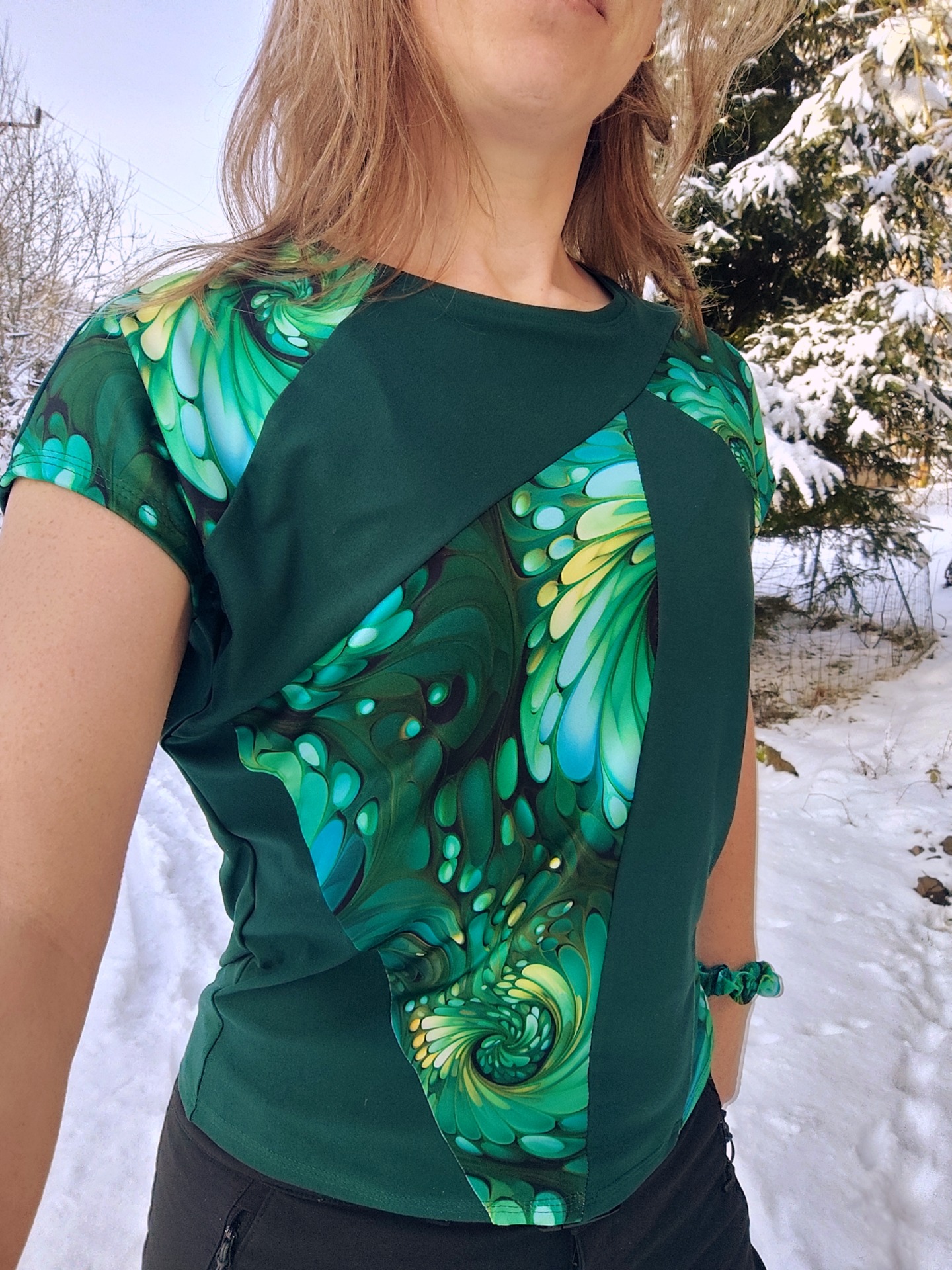 Tričko z příjemného úpletu, kombinace jednobarevné zelené a barevné v zelených tónech, elastické, lehoučké, příjemné na dotek.