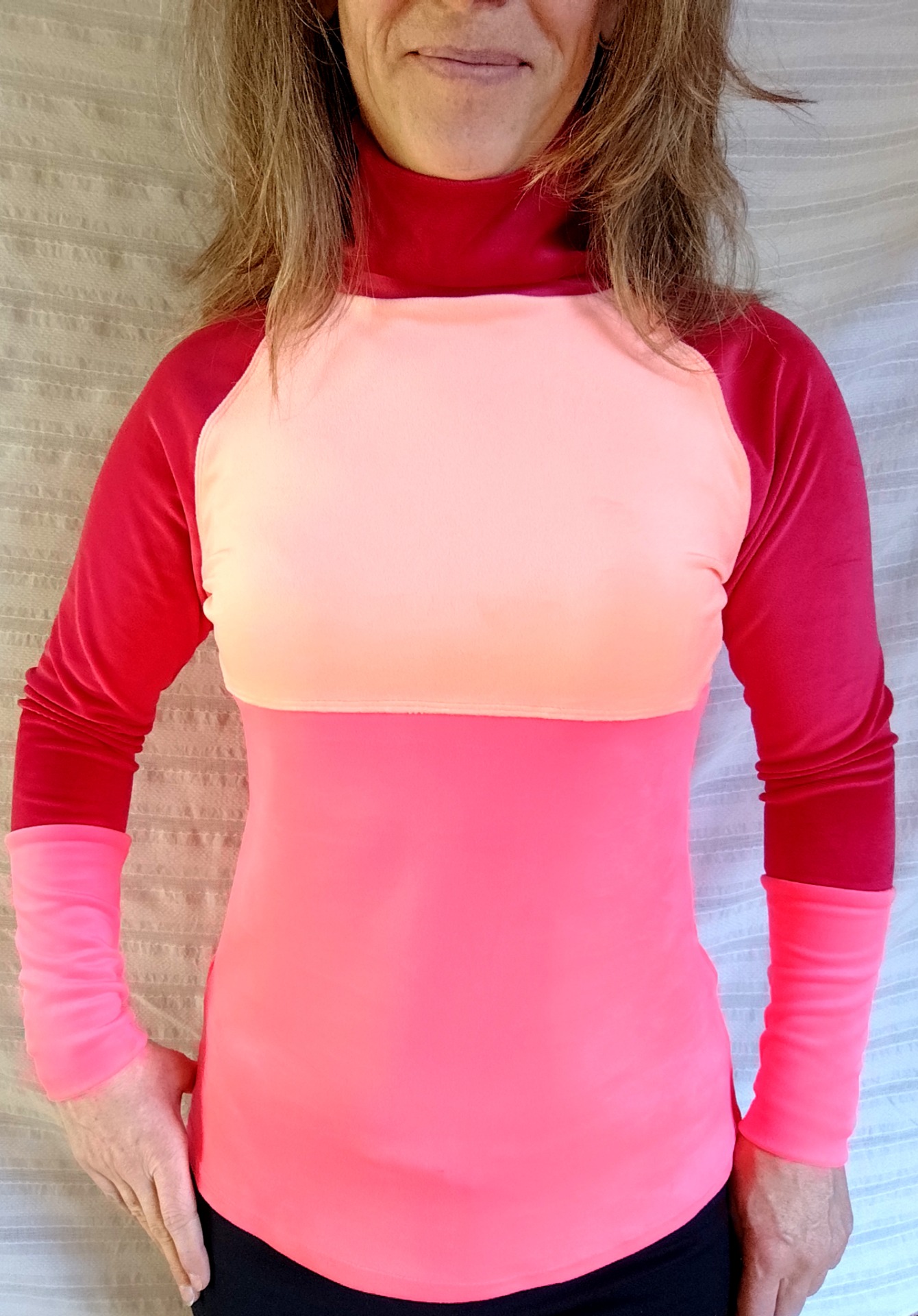 délka 64 cm přední díl, délka zadní díl 66 cm, výška roláku 11 cm, délka raglánového rukávu (tj. od roláku) 69 cm